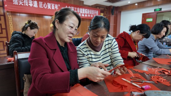 剪刀翻飛,紅紙生花。走進(jìn)甘肅省嘉峪關(guān)市工人文化宮14樓,職工大講堂內(nèi)燈火通明,40名職工圍坐桌前,手持剪刀在紅紙上細(xì)致勾勒,空氣中洋溢著專注與喜悅。隨著一張張?jiān)⒁饧榈募y樣逐漸成形,由市總工會(huì)主辦的“指尖傳非遺 匠心賀百年”全市職工非遺剪紙培訓(xùn)班正在溫情開講。