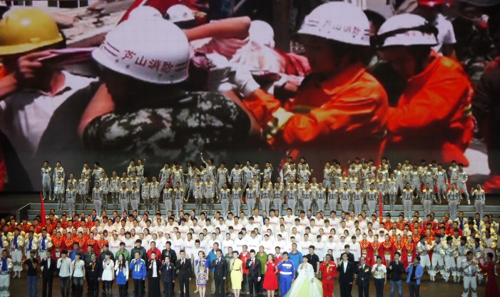 演出開始,全體參演人員和現(xiàn)場觀眾攜手演唱歌曲《我們眾志成城》,向一周前遭受蘆山“4·20”地震災害的同胞表達最有力的支持和最誠摯的慰問。這一與以往不同的“開場”,迅速為整臺晚會奠定了理性和堅強的基調:沒有任何一種力量能夠擊垮屬于中國的春天!