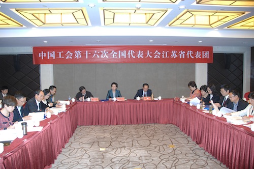 中國工會(huì)十六大日前在京開幕,江蘇代表團(tuán)熱烈討論黨中央祝詞和中國工會(huì)十六大報(bào)告。
