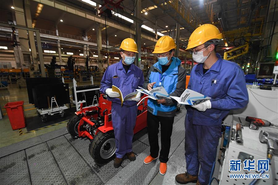 2月24日,杭州臨安區(qū)青山湖科技城工會的工作人員(中)給杭叉集團的工人上門宣傳疫情防控期間有關(guān)勞動合同、工資報酬等政策措施。杭叉集團是中國目前最大的叉車研發(fā)制造集團之一,集團共有員工4100余人。目前杭叉集團已全面復工復產(chǎn),返崗人員達90%。 新華社記者 徐昱 攝