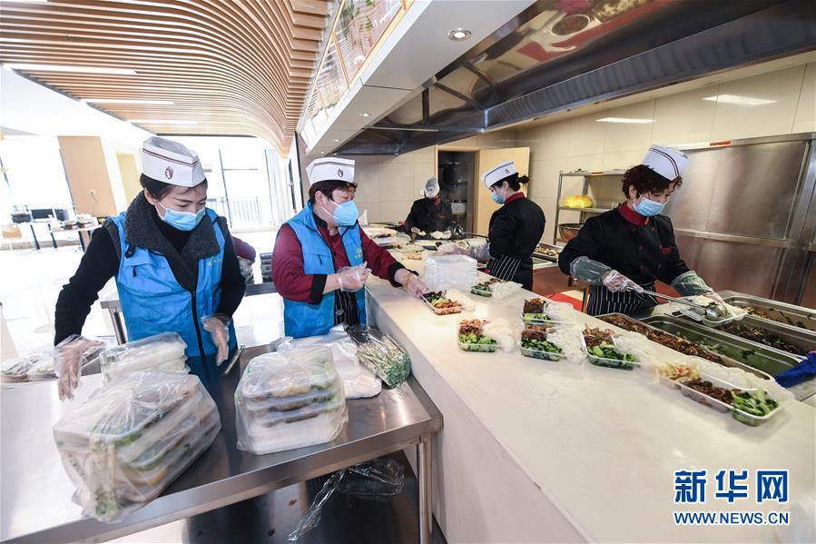 2月24日,杭州臨安區(qū)青山湖科技城工會的志愿者們在服務點幫助打包快餐,該服務點每天要為受疫情影響而實行分餐制的企業(yè)配送近千份快餐。 新華社記者 徐昱 攝