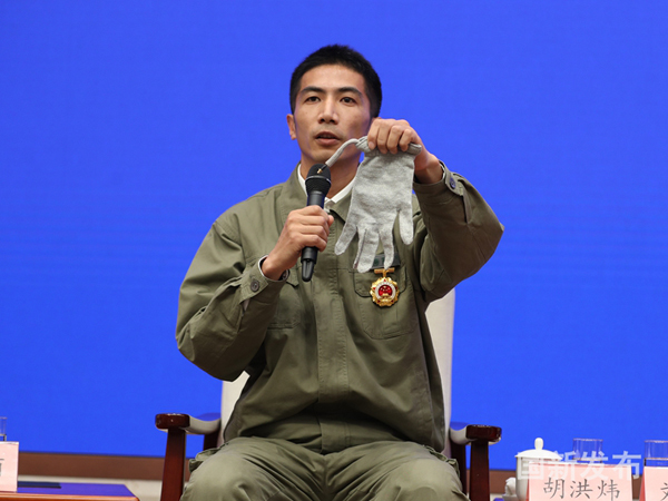 各位記者朋友們,大家好,我叫胡洪煒。2000年退伍以后成為我們國(guó)網(wǎng)湖北電力的一名一線工人,也正好趕上我們國(guó)家大力發(fā)展“電力高速公路”建設(shè),就是通過(guò)超高壓、特高壓輸電線路在全國(guó)長(zhǎng)距離的進(jìn)行電力資源調(diào)配,特高壓帶電作業(yè)一直是世界的禁區(qū),但禁區(qū)也得有人去闖,2009年我非常有幸成為世界±800千伏特高壓帶電作業(yè)第一人。這是我們一直使用的手套,它是金屬絲和金屬粉末混編而成的,這里小個(gè)小辮子,它是連接衣服、褲子、襪子,幫它變成一個(gè)整體,就好像我們被一個(gè)金屬籠子保護(hù)起來(lái),然后從事帶電作業(yè)。所以有人稱(chēng)我們是守護(hù)電網(wǎng)的特種兵,我就先介紹到這兒。謝謝。
