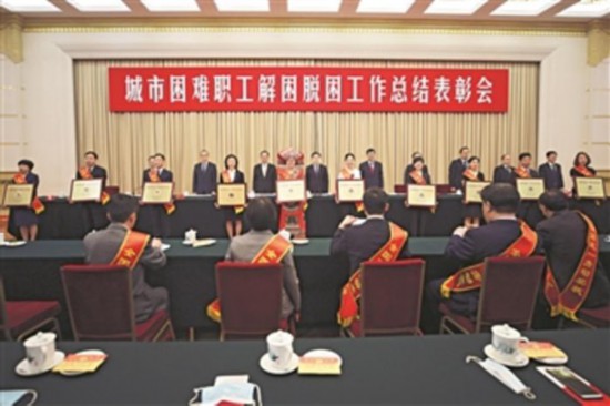 5月31日,城市困難職工解困脫困工作總結(jié)表彰會在北京召開。圖為表彰會現(xiàn)場。
