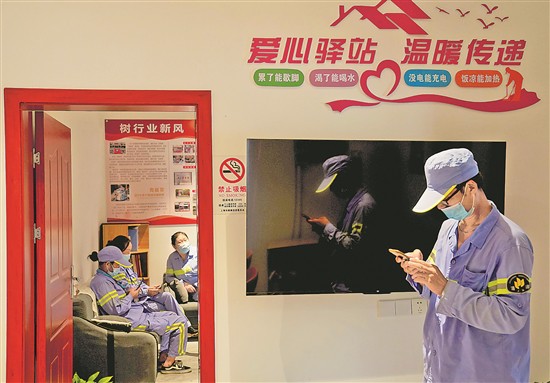 近日,在上海虹口區(qū)三河路上,愛心驛站對附近的環(huán)衛(wèi)、園林、市政等戶外勞動者開放。午間時段,在此休息的環(huán)衛(wèi)工人們可以洗把臉,吹著空調聊聊天,清涼中透著融融“暖意”。