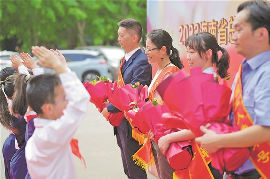 少先隊(duì)員向榮獲2023年全國、省五一勞動(dòng)獎(jiǎng)和工人先鋒號(hào)的集體與個(gè)人代表獻(xiàn)花。