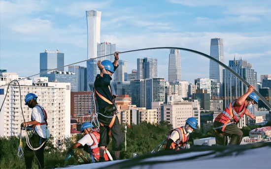 圖為2022年7月18日,在北京工人體育場改造復(fù)建工程的頂棚上,工人在太陽的余暉下作業(yè)。 工人日報(bào)記者 吳凡/攝