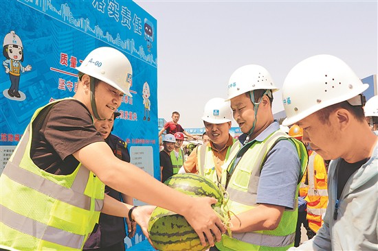 6月16日,中建八局一公司濟(jì)南醫(yī)院項目工會在“清涼驛站”為職工發(fā)放防暑物品。連日來,山東大部分地區(qū)出現(xiàn)高溫天氣,山東省建設(shè)工會及時指導(dǎo)各委員單位開展職工防暑降溫工作和“送清涼”活動,維護(hù)勞動者的健康權(quán)益。 本報記者 田國壘 本報通訊員 王軼 攝