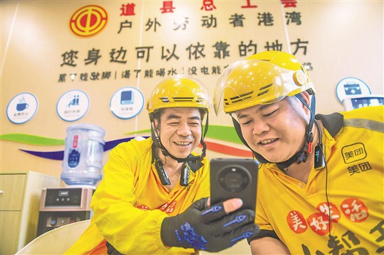 近日,外賣(mài)配送員在湖南省永州市道縣月巖西路戶外愛(ài)心驛站休息。近年來(lái),道縣充分發(fā)揮工會(huì)優(yōu)勢(shì),形成“黨群服務(wù)陣地+愛(ài)心驛站”“商圈企業(yè)+愛(ài)心驛站”等“驛站+”建設(shè)模式。驛站里配備微波爐、飲水機(jī)、應(yīng)急醫(yī)藥箱、充電插座等服務(wù)設(shè)施,為快遞員、外賣(mài)配送員、環(huán)衛(wèi)工人等戶外勞動(dòng)者提供便利“歇腳地”。本報(bào)通訊員 蔣克青 李猛慶 攝