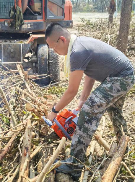 經(jīng)過實地調(diào)查過后,服務隊發(fā)現(xiàn)清障項目難度大、任務重,超越了人力勝任的范疇。于是領隊及時調(diào)整策略,積極籌集垃圾運輸車、大卡車、挖機、油鋸、鐵耙等工具,幫助清障。同時,將服務隊化整為零,有的負責清理道路上倒塌的樹木和雜物,有的協(xié)助當?shù)卣蜕鐓^(qū)工作人員進行房屋檢查和維修工作,有的深入受災群眾家中幫助清理房屋。