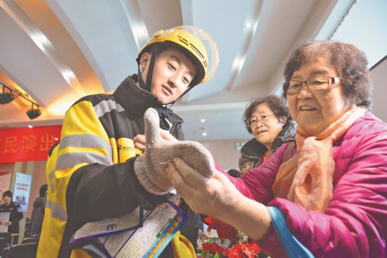 “大小合適嗎?”“暖和嗎?”12月4日,在天津市和平區(qū)南營門街文化活動中心,82歲的志愿者張鳳蘭(右一)老人將自己新織的手套送給了一名外賣小哥。
