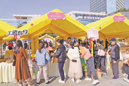 12月21日,由福建省廈門市總工會聯(lián)合多家單位共同舉辦的“雙愛同心 和諧共贏”工會會員服務(wù)日活動在廈門市工人文化宮舉行。全總廈門火炬高技術(shù)產(chǎn)業(yè)開發(fā)區(qū)蹲點(diǎn)干部、“雙愛典范”企業(yè)代表、新就業(yè)形態(tài)勞動者、愛心企業(yè)、特惠商戶等600人共赴工“惠”之約。112戶特惠商家入駐集市,為職工提供“衣、食、住、行、游、娛、購”全方位的消費(fèi)服務(wù)。