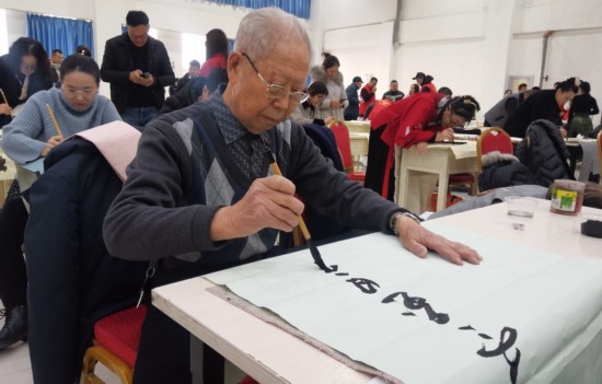 84歲的彭果干老人為了此次活動精心籌備,提前創(chuàng)作了一首冬至主題的詩作,并在現(xiàn)場揮毫潑墨,書寫心中的詩意與豪情。他說:“在冬至這個特殊的日子里,以詩表意,以書傳情,還能欣賞眾多冬至主題的書法佳作,實(shí)在是意義非凡,讓中華優(yōu)秀傳統(tǒng)文化在筆墨間傳承。”(圖 袁海軍攝)
