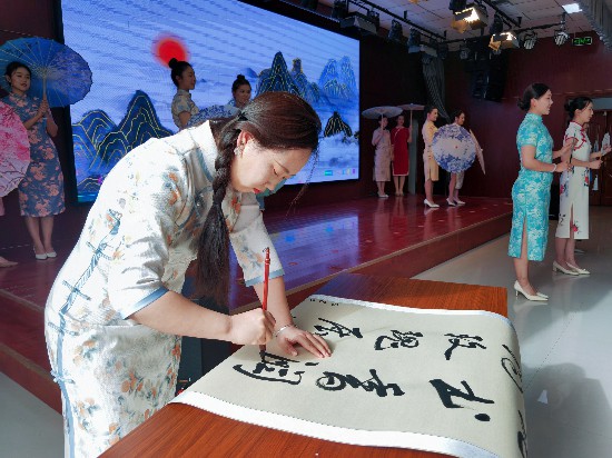 女職工現(xiàn)場寫書法。黃萬里 攝