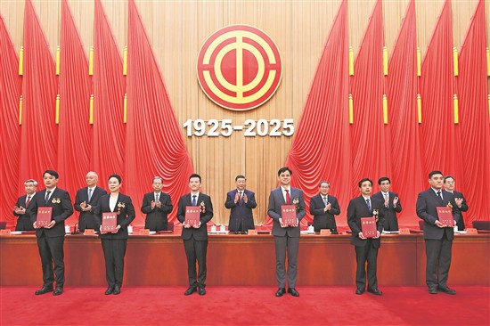 人民大會堂大禮堂氣氛隆重熱烈。主席臺上方懸掛著“慶祝中華全國總工會成立100周年暨全國勞動模范和先進工作者表彰大會”會標,后幕正中懸掛中國工會會徽,會徽下方是“1925-2025”字標,10面紅旗分列兩側(cè)。二樓眺臺懸掛著標語:“以習近平新時代中國特色社會主義思想為指導,堅定不移聽黨話跟黨走,在以中國式現(xiàn)代化全面推進強國建設(shè)、民族復興偉業(yè)中充分發(fā)揮工人階級主力軍作用和工會橋梁紐帶作用!”
