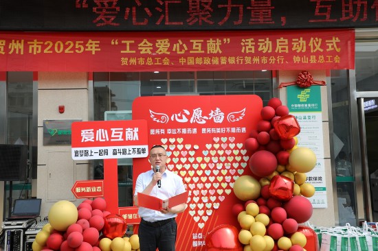 4月28日,廣西壯族自治區(qū)賀州市總工會、中國郵政儲蓄銀行賀州市分行、鐘山縣總工會聯(lián)合在中國郵政儲蓄銀行鐘山縣支行工會驛站舉行“工會愛心互獻(xiàn)”活動啟動儀式,標(biāo)志著全市2025年“工會愛心互獻(xiàn)”活動啟動。