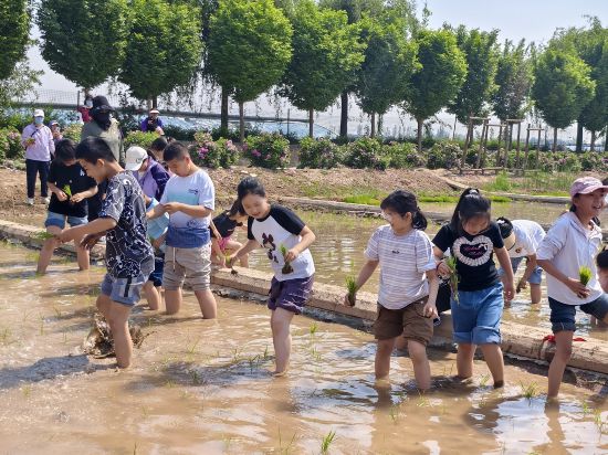 在寧夏稻漁空間生態(tài)觀光園,參與者們在講解員的引導(dǎo)下登上觀景塔,一覽大地藝術(shù)的壯麗景色。走在田間棧道上,他們認(rèn)真聆聽關(guān)于水稻養(yǎng)魚、魚稻共生的故事,感受塞上鄉(xiāng)村的魅力,解密稻魚共生的秘密,體驗(yàn)稻漁產(chǎn)業(yè)之美。來到勞動(dòng)實(shí)踐區(qū),他們卷起褲腳走進(jìn)泥田,孩子們學(xué)著“師傅”的樣子,用指尖捏著秧苗,弓腰插入松軟的泥土中,看著嫩綠的秧苗在水田中“列隊(duì)”,深刻體會(huì)到了勞動(dòng)的自豪與不易。