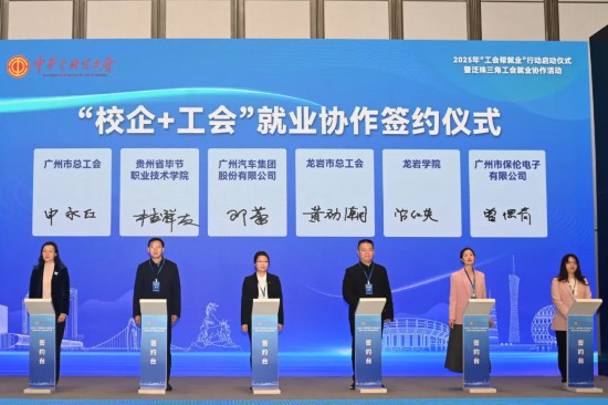 2025年2月27日,中華全國總工會在廣東省廣州市啟動2025年“工會幫就業(yè)”行動。圖為“校企+工會”就業(yè)協(xié)作簽約儀式。中新社記者 陳楚紅/攝