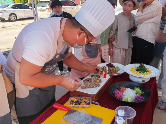 活動(dòng)現(xiàn)場,烹、炒、煎、炸等烹飪技藝輪番上演。灶臺(tái)間,油爆聲與蒸汽升騰交織,選手們各顯神通:有的手持鍋鏟,快速翻炒著五顏六色的配菜;有的專注燉煮,緊盯翻滾湯汁,適時(shí)調(diào)整火候。各項(xiàng)精湛嫻熟的烹飪技法加上精美的擺盤,展現(xiàn)出選手們高超的烹飪水準(zhǔn)及對(duì)比賽的重視。此外,比賽選用本地土雞、六盤山黃牛肉、時(shí)令有機(jī)時(shí)蔬、醇厚胡麻油、筋道紅軍粉、天然苦苦菜等特色農(nóng)家食材,種類豐富、品質(zhì)優(yōu)良,確保了鄉(xiāng)宴美食的優(yōu)質(zhì)口感。