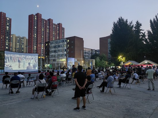 19時(shí)30分,夕陽的余暉還未完全散去,青年公寓籃球場(chǎng)內(nèi)的放映設(shè)備準(zhǔn)備就緒,一場(chǎng)露天電影即將拉開序幕。職工們?nèi)齼蓛?,有的搬來了小板凳,有的干脆席地而坐,不一?huì)兒就聚滿了人。隨著一束光投射在大幕布上,《志愿軍:雄兵出擊》的電影畫面緩緩呈現(xiàn),經(jīng)典的旋律與動(dòng)人的故事瞬間吸引了所有人的目光。